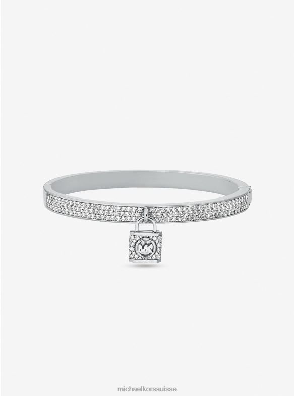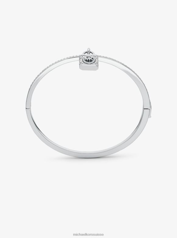 inspiré des détails de notre bien-aimé sac Hamilton, ce bracelet jonc en laiton plaqué platine est parsemé de trois rangées de pavés et orné d’une breloque cadenas emblématique. une fermeture à charnière facilite son enfilage et son retrait.