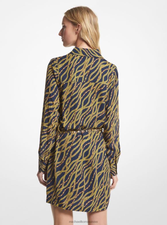 confectionnée à partir d’un mélange de viscose et de soie georgette, cette robe-chemise aérienne prend vie avec notre version graphique d’un imprimé à maillons de chaîne héritage. une ceinture métallique définit la plus petite partie de votre silhouette, tandis que les boutons dorés ajoutent une finition glamour.