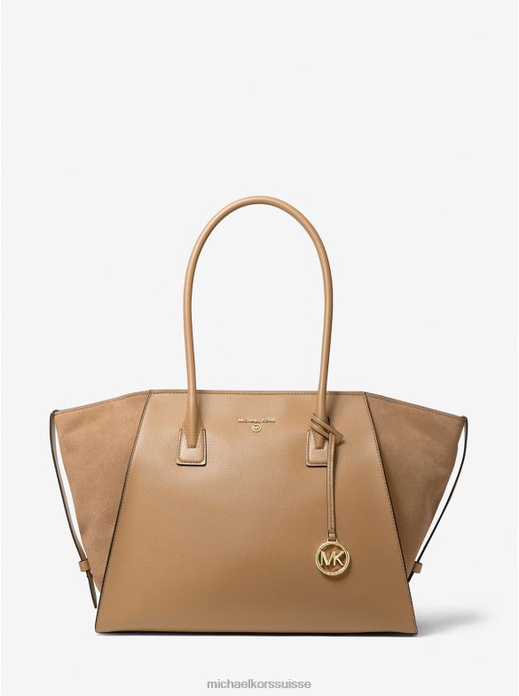 conçu dans une silhouette structurée avec un intérieur ultra-spacieux, notre sac fourre-tout avril est la réponse à un trajet chic. il est confectionné en cuir grainé et en daim riche pour une finition raffinée, tandis que notre breloque « mk » ultra brillante lui confère une touche de nouveauté. nous aimons la façon dont la poche extérieure gardera votre porte-cartes et votre téléphone à portée de main.