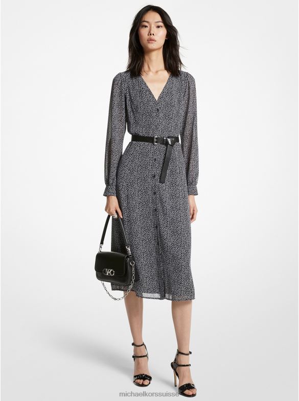 défini par un imprimé girafe moderne, cette robe en georgette est au-dessus des autres. sa silhouette midi présente un devant boutonné avec des manches légèrement bouffantes et une ceinture définissant la taille. Portez-la avec des sandales en cuir à lanières pour équilibrer la sensibilité romantique avec une touche de luxe robuste.