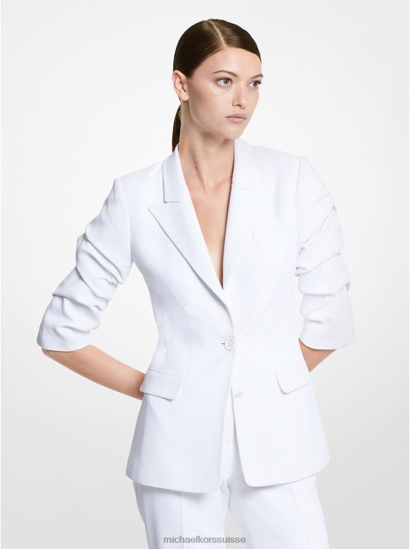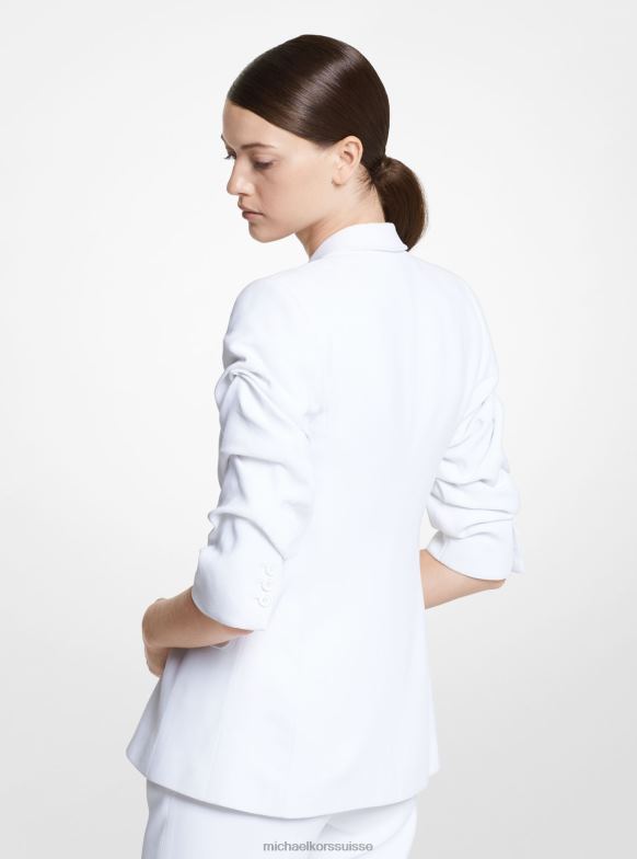 les manches froissées confèrent un attrait moderne à ce blazer à un bouton, tandis que le double crêpe sable et la taille cintrée témoignent d’une couture italienne méticuleuse. complétez un ensemble moderne avec le pantalon assorti et un caraco en satin. fabriqué en Italie.