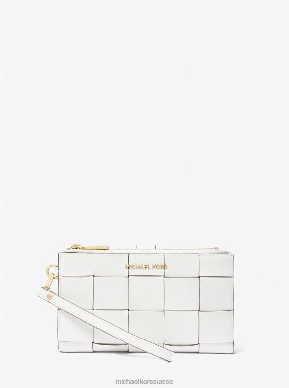 confectionné à partir de bandes tissées de cuir souple, ce portefeuille est doté de deux côtés zippés qui se déplient pour révéler un centre avec des poches pour tous les essentiels, des cartes de crédit à votre smartphone. une dragonne amovible le rend suffisamment polyvalent pour être porté seul ou dans un fourre-tout.