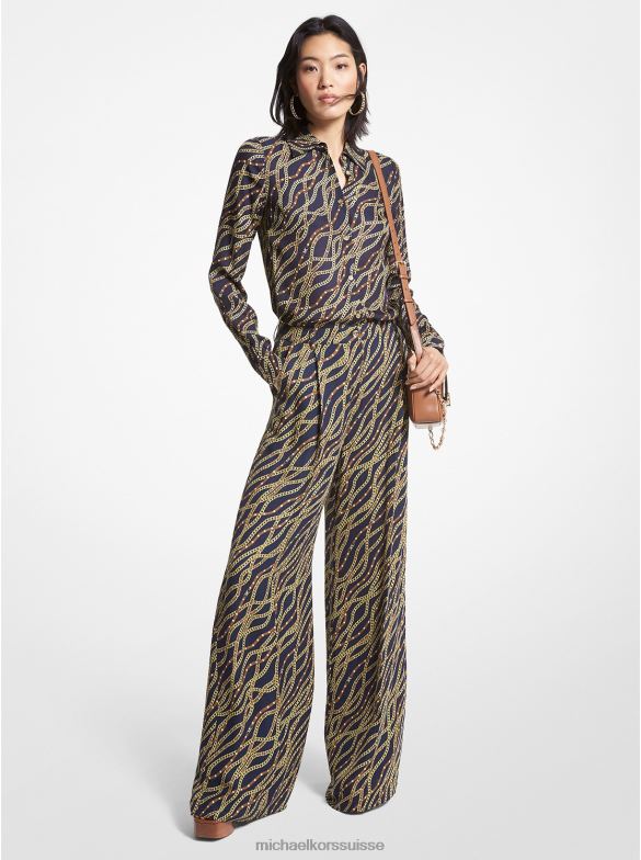 confectionné dans un mélange de viscose avec des notes de soie, ce pantalon large en georgette présente notre imprimé graphique à maillons de chaîne d’inspiration patrimoniale pour un impact majeur. Gardez les accessoires minimalistes avec un sac couleur bagage et des chaussures compensées très hautes dans une teinte assortie.