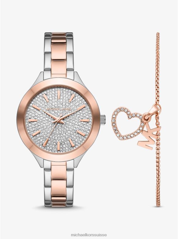 notre ensemble montre et bracelet cœur est le cadeau qu’elle souhaite. fabriquée en acier inoxydable bicolore, cette montre de défilé mince est dotée d’un cadran aux accents pavés qui capte la lumière de manière glamour. il est particulièrement luxueux associé au bracelet assorti, qui présente une breloque en forme de cœur accentuée de pavés pour compléter le cadran de la montre.